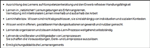 „Kompetenzentwicklung bedeutet in diesem Fall das Kennenlernen und Ausprobieren individueller und kollektiver Lern- und Handlungsstrategien, aber ebenso Aufspüren und Experimentieren mit organisational verankerten Lern- und Handlungsmodi.“ (NOVAK 2002, 175.)