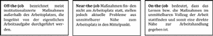 Eine Integration der Lerninhalte in ein Kompetenzmanagementsystem ist maßgeblich von der Nähe bzw. der Distanz zwischen Arbeitsaufgabe und Ort der Maßnahme abhängig. Unterschieden wird dabei in der Literatur nach der ‚...-the job Systematik’ zwischen on-, near- und off-the-job Maßnahmen (vgl. STEPHAN/ ZIEGLER 2002, 414f)[5]. Darüber hinaus sind weitere Differenzierungen, wie z. B. into-the-job und out-of-the-job, zu verzeichnen. Allgemein lässt sich sagen, dass „je näher eine Maßnahme mit dem Arbeitsplatz verbunden ist, desto realer sind die Lernbedingungen und desto leichter fällt dem Teilnehmer in der Regel der Lerntransfer“ (ders., 415).