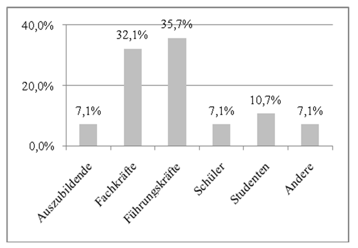 Die Auswertung der Interviews im Hinblick auf die Teilnehmerzielgruppen stützt die aus der Dokumentenanalyse gewonnen Erkenntnisse. Insbesondere geben 85,8 % der befragten Unternehmen an, dass für Fach- und Führungskräfte Schulungen im interkulturellen Bereich vorgesehen sind, lediglich 14,2 % sehen die Notwendigkeit zum Einbeziehen von Auszubildenden in diese Maßnahmen.[3] Bei den interviewten externen Bildungsanbietern spiegelt sich dieser Trend ebenfalls wieder, wenn auch nicht ganz so deutlich. Die gewonnenen Erkenntnisse sind in der nebenstehenden Grafik zusammengefasst.[4]
