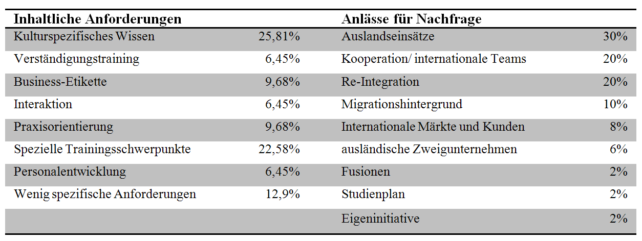 Auch Re-Integrationsmaßnahmen werden seitens der Unternehmen häufig nachgefragt (20 %). 10 % der Seminare finden im Zusammenhang mit Problemen, die auf Migrationshintergründen basieren, statt. Ausländische Kundenkontakte und das Agieren auf internationalen Märkten (8 %), Zweigunternehmen im Ausland (6 %), mögliche Fusionen, Einbettung interkultureller Inhalte in Studienpläne sowie eine Teilnahme aus Eigeninitiative stellen weitere Nachfrageschwerpunkte dar, wobei die zuletzt genannten mit 2 % aber einen wesentlich geringeren Anteil einnehmen.[6] Aus den einzelnen genannten Weiterbildungsbedarfen können diverse und bisweilen auch spezifische inhaltliche Anforderungen resultieren, die seitens der Nachfrager an die Anbieter herangetragen werden.