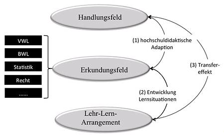 Zunächst wären die zukünftigen Handlungsfelder der Studierenden in den Fokus zu nehmen, die die Basis für die hochschuldidaktische Adaption der ‚Lernfelder’ resp. der Erkundungsfelder (zur Begriffsbestimmung vgl. 3.2.1) darstellen. Ein Erkundungsfeld speist sich dabei aus unterschiedlichen situativen Settings, die ‚typisch’ für ein bestimmtes Handlungsfeld sind. In den Erkundungsfeldern und deren situativer Ausgestaltung kommt die Fachstruktur – hier exemplarisch die Struktur der Wirtschaftswissenschaften – zum Tragen. Die Inhalte leiten sich auf Basis der Anforderung der Situation her. Ausgehend von den Erkundungsfeldern wären Lernsituationen zu entwickeln. Der Transfereffekt soll aufzeigen, dass bei diesem Konzept von einer handlungslogischen Strukturierung des Lernprozesses der Studierenden ausgegangen wird, womit der Transfer des Erlernten in den zukünftigen Handlungsfeldern adäquater gelingen könnte. Für die Adaption wäre zum einen der Schritt vom Handlungs- zum Erkundungsfeld zu klären (Abschnitt 3.2.1) und zum anderen der Schritt bzw. die lerntheoretischen Folgerungen vom Erkundungsfeld zur Lernsituation (Abschnitt 3.2.2) zu erörtern.