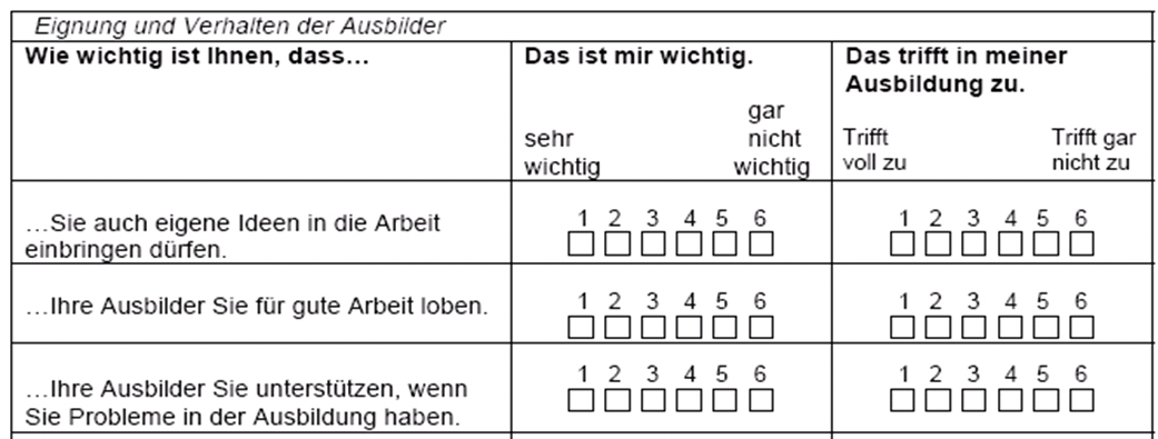 Da sich die Perspektiven der an der Ausbildung Beteiligten je nach Zielen unterscheiden können, wurden im weiteren Verlauf des Projektes auch Auszubildende zu ihrem bestehenden Qualitätsverständnis befragt. Für diese Datenerhebung wurde, angelehnt an eine BIBB-Erhebung aus dem Jahr 2008 (vgl. BEICHT et al. 2009) ein überwiegend standardisierter Fragebogen konzipiert, der die Qualitätsdimensionen des im Kapitel 1.4.1 beschriebenen BIBB-Modells erfasst. Die Mehrzahl der Fragen enthält eine Soll-Ist-Analyse der betrieblichen Ausbildungsqualität aus Sicht der Auszubildenden (siehe Abbildung 2). Sie wurden um offene Fragen zu Beispielen für eine gute Ausbildung und zur Einschätzung der Ausbildungsqualität im Betrieb ergänzt.