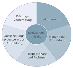 Dazu soll gemeinsam mit Handwerksbetrieben im Kammerbezirk Hannover, der Handwerkskammer Hannover und der ZWH für die qualitätsrelevanten Phasen der Ausbildung konkrete Instrumente zur Qualitätssicherung und -entwicklung erarbeitet und erprobt werden. Aufgrund der Vorerfahrungen der Verbundpartner in der beruflichen Erstausbildung wurden für das Projekt fünf für die Ausbildungsqualität besonders wichtige Phasen definiert: 1. Rekrutierung, 2. Planung der Ausbildung, 3. Einstiegsphase und Probezeit, 4. Qualifizierungsprozesse in der Ausbildung und 5. Prüfungsvorbereitung (siehe Abbildung 1):