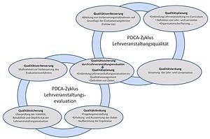 Aus dieser Abbildung wird ersichtlich, dass innerhalb eines Qualitätskreislaufs, weitere Qualitätskreisläufe stattfinden können. Das Ziel, die Lehrveranstaltungsqualität zu sichern und zu verbessern, durchläuft den PDCA-Zyklus, indem die Veranstaltung geplant, umgesetzt, überprüft und weiterentwickelt wird. Innerhalb der Überprüfung findet wiederum in einem separaten PDCA-Kreislauf die Lehrveranstaltungsevaluation statt.