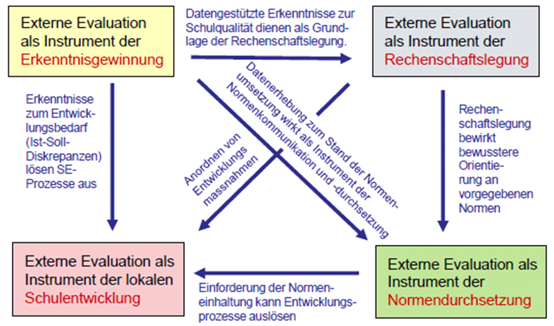 Externe Schulevaluation kann mit verschiedenen Funktionen bzw. Zielen verbunden sein. LANDWEHR unterscheidet folgende vier Hauptfunktionen externer Schulevaluation: Wissensgewinnung (die Schule erhält datengestütztes Qualitätswissen), Schulentwicklung (Schul- und Unterrichtsentwicklungsprozesse können zur Beseitigung von Qualitätsdefiziten und zum Ausbau von Stärken angestoßen werden), Rechenschaftslegung (die Schule erhält eine glaubwürdige Datengrundlage für einen Qualitätsnachweis) und Normendurchsetzung (geltende Normen werden bewusst gemacht und deren Umsetzung wird verbindlich eingefordert) (vgl. LANDWEHR 2011, 39ff.).