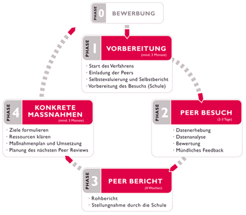 Peer Review in QIBB läuft in fünf logisch aufeinander folgenden Phasen ab (vgl. dazu ausführlich: http://www.peer-review-in-qibb.at/ablauf):