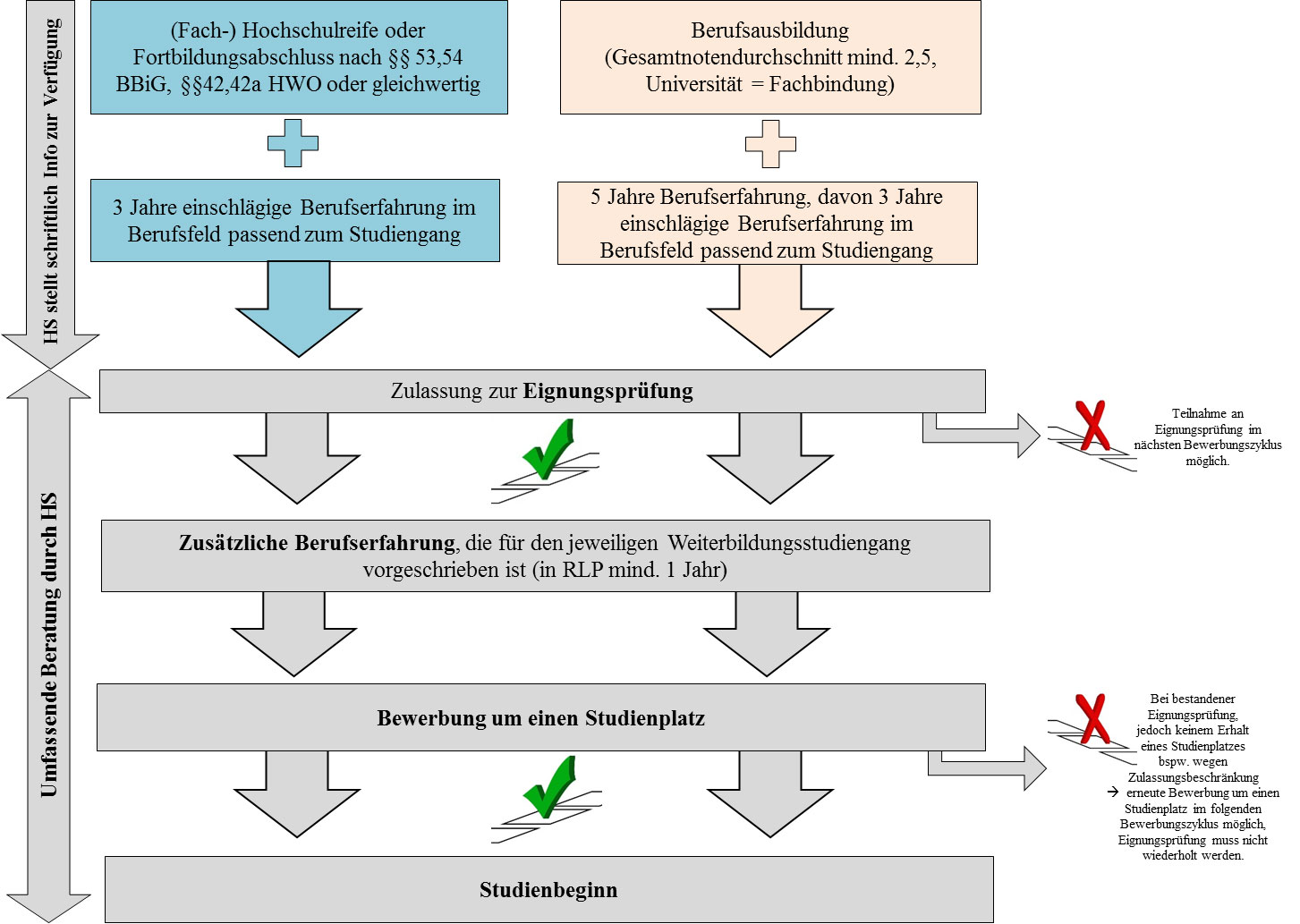 Zentral beim Zugang zum weiterbildenden Masterstudium ohne absolviertes Erststudium sind neben den formalen Zugangsvoraussetzungen die Elemente der Beratung und der Eignungsprüfung durch die Hochschulen. Nach der formalen Einreichung der Bewerbungsunterlagen bei der von dem Interessenten/ der Interessentin gewählten Hochschule, wird diese/r (vorausgesetzt, dass die Zugangsvoraussetzungen erfüllt sind) von der Hochschule zur Eignungsprüfung zugelassen, die sowohl für die Prüflinge als auch für die Hochschule die größere Herausforderung in diesem Verfahren darstellt. Besteht der/ die Kandidat/in die Eignungsprüfung, kann er/sie sich mit der ausgestellten Bescheinigung um einen regulären Studienplatz bewerben. Hierbei ist zu beachten, dass i.d.R. noch weitere Jahre an (einschlägiger) Berufserfahrung nachzuweisen sind und der gewählte Studiengang ggf. zulassungsbeschränkt sein kann. Dies bedeutet, dass eine bestandene Eignungsprüfung noch keinen Studienplatz garantiert. Verfehlt der Interessent/ die Interessentin die Aufnahme in den Studiengang, so hat er/sie die Möglichkeit sich im darauffolgenden Zyklus wieder um einen Studienplatz zu bewerben (Anzahl der Wiederbewerbungen werden i.d.R. durch Prüfungsordnungen der jeweiligen Studiengänge geregelt). Beim Scheitern in der Eignungsprüfung hat der Interessent/ die Interessentin die Möglichkeit, die Prüfung im darauffolgenden Turnus zu wiederholen. Dabei legen die jeweiligen Fachbereiche die Strukturen der Eignungsprüfung fest, die in Rheinland-Pfalz für den Prüfling derzeit noch kostenfrei ist.