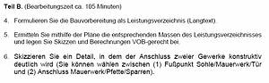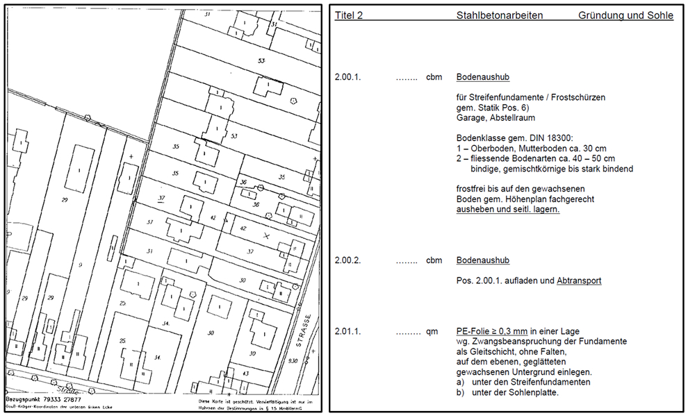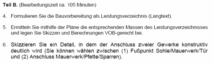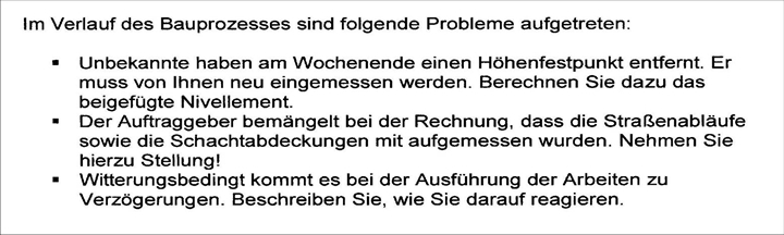 Jede Aufgabe enthält eine möglichst exakte und authentische Darstellung einer Bausituation. Dazu gehören neben der Beschreibung der relevanten Rahmenbedingungen (zum Beispiel Jahreszeit, Verkehrssituation) auch die üblichen Bauunterlagen. Dieses sind in der Regel Ausschnitte aus Originaldokumenten, wie Zeichnungen, Lagepläne, Leistungsverzeichnisse u.Ä. (siehe Abb. 5).