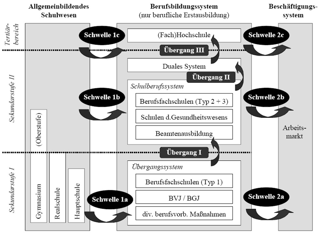 Auf den ersten Blick lassen diese Zahlen scheinbar den Schluss zu, dass sich die Berufsfachschule als eine gleichwertige Alternative, wenn nicht sogar als „kräftigeres Standbein“ der Bauzeichnerausbildung an der Martin-Wagner-Schule entwickelt hat. Doch dieser Schein trügt. Treten die Absolventen beider Bildungswege auf dem Arbeitsmarkt in Konkurrenz, wird es aus mehreren Gründen offensichtlich, dass die vollzeitschulisch ausgebildeten Bauzeichner (Aus Gründen der besseren Lesbarkeit wird im Text nur die männliche Schreibweise verwendet. Generell sind beide Geschlechter gleichermaßen angesprochen.) nur schwerlich eine ausbildungsadäquate Beschäftigung finden werden. Zum einen fragt die Berliner Bauwirtschaft über die Ausbildungsverträge lediglich 27 Bauzeichner in Berlin nach, so dass, den tatsächlichen Bedarf ignorierend, 41 zusätzliche Absolventen „am Markt vorbei“ angeboten werden. Der Bedarf aller Bundesländer zusammen liegt, um eine Vergleichsgröße zu nennen, z. Z. bei ca. 175 Bauzeichnern pro Jahr (vgl. GESELLSCHAFT ZUR FÖRDERUNG DES DEUTSCHEN BAUGEWERBES 2009, 68). Zum anderen sind die Absolventen der Berufsfachschule bei der Einmündung in den Arbeitsmarkt gegenüber ihren Mitbewerbern stark benachteiligt, denn die vollzeitschulische Ausbildung steht in der öffentlichen Wahrnehmung nach wie vor „im Schatten der dualen Berufsausbildung“ (AUTORENGRUPPE BILDUNGSBERICHTERSTATTUNG 2008, 104). Sie gilt als „praxisfremd und kostenträchtig“ (ebd.) und wird „…von den Arbeitgeberverbänden sowie von den Gewerkschaften aus interessenpolitischen Gründen ganz offen diskriminiert…“ und abgewertet (GREINERT 2007, 4). Aus diesen Vorurteilen resultiert für Abgänger der beruflichen Vollzeitschulen ein erschwerter Übergang an der „Zweiten Schwelle“ (zum Zweischwellenmodell und seiner kritischen Diskussion vgl. Abb. 2 und 3 sowie umfassend RUF 2007, 57ff.).