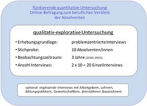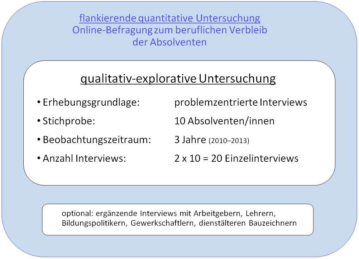 Primäre Erhebungsgrundlage der Studie sind die problemzentrierten Interviews. Vorgesehen sind zwei Interviewreihen im Sommer 2011 und 2012 mit jeweils zehn Gesprächen. Optional und nach Forschungsfortschritt sind darüber hinaus auch ergänzende Interviews mit Arbeitgebern (zum Beispiel zum Thema Rekrutierungsstrategien), Lehrern, Bildungspolitikern, Gewerkschaftern, berufserfahrenen Bauzeichnern denkbar. Um den Untersuchungsgegenstand aus verschiedenen Perspektiven betrachten zu können, sind auch teilnehmende Beobachtungen vorgesehen (vgl. FRIEBERTSHÄUSER 2010, 175; zur Forschungsmethode der Triangulation vgl. auch FLICK 2008).