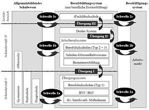 Dem „klassischen“ Zweischwellenmodell (vgl. Abb. 2) liegt die anachronistische Vorstellung einer Normalerwerbsbiografie zugrunde. Mit dieser reduzierten Vorstellung kann die Vielfalt der möglichen Übergänge im heutigen Berufsbildungssystem nicht abgebildet werden (vgl. RUF 2007). Ein Bild von „Wegen durch ein Labyrinth“ käme der Realität schon seit langem näher (WESTHOFF 1991, 54). RUF hat dementsprechend ein modifiziertes Schwellenmodell vorgestellt (vgl. Abb. 3).