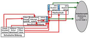 Der Heterogenität der Logopädie/Sprachtherapie entsprechend sind im Bildungssystem viele und unterschiedliche Übergänge zu verorten. Die folgende Grafik (Abb. 1) nutzt zur Darstellung der Übergänge die Systematik, die auch im Bericht Bildung in Deutschland 2010 (BMBF, 2010) verwendet wird, die zwischen schulischer, beruflicher und hochschulischer Bildung unterscheidet. Übergänge sind zwischen diesen Systemkomponenten und in den Arbeitsmarkt hinein vorhanden.