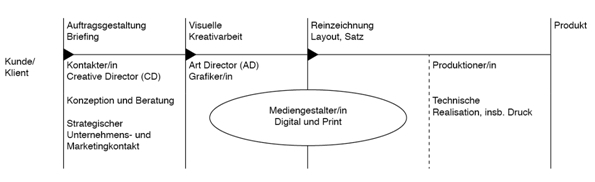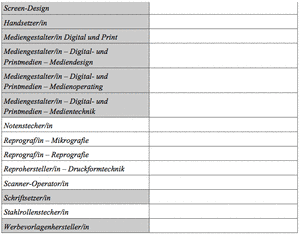 Die Neuordnung der Berufe der Mediengestalter/in Digital und Print folgte 1998 nicht nur dem Wandel der Verfahrenstechnik der Realisationsmedien (BfWT 1998). Auch vor dem Hintergrund der geänderten Anforderungen im Workflow wurden damals die Berufe Fotogravurzeichner/in, Reprograf/in, Schriftsetzer/in sowie Druckform- und Druckvorlagenhersteller/in (zwischenzeitlich gemeinsam Reprohersteller/in) sowie Werbevorlagenhersteller/in beziehungsweise Werbe- und Medienvorlagenhersteller/in im Berufsbild Mediengestalter/in Digital und Print zusammengeführt.
