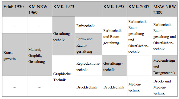Die jahrzehntelange Vernachlässigung der designerischen und designnahen Berufe in der beruflichen Lehrerbildung hat Ursachen, die in das Jahre 1973 zurückreichen. Zuvor war es selbstverständlich, für die Gewerbelehrerbildung in den gestalterischen Berufen eine eigene Fachrichtung Kunstgewerbe vorzusehen, wie dies etwa 1930 ein Erlaß des Preußischen Ministers für Handel und Gewerbe dokumentiert (HERKNER 2010, 39). In diesem Sinne wurden in Nordrhein-Westfalen noch 1965 Lehrpläne für gewerblich-technische Berufsschulen, Kunstgewerbliche Berufe und 1967 Lehrpläne für gewerblich-technische Berufsschulen, Grafische Berufe erlassen, die jeweils gestalterisch zentriert waren, und 1969 die gemeinsame berufliche Fachrichtung Malerei, Graphik, Gestaltung den Anforderungen an eine eigenständige Lehrerbildung für alle gestalterischen Berufen fachlich angemessen präzisiert (KM NRW 1969).