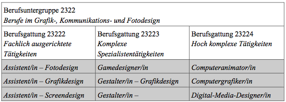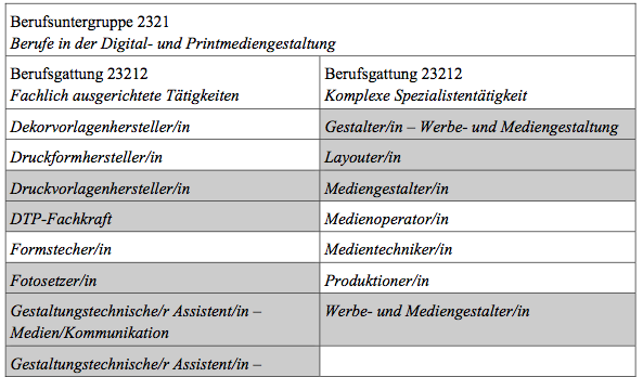Die von der Bundesagentur für Arbeit (BfA) 2010 veröffentlichte Klassifikation der Berufe (BA 2010), die sich hier ihrerseits an der International Standard Classification of Occupations von 2008 orientiert, ordnet den Beruf Mediengestalter/in – Digital- und Printmedien in der Berufsgruppe technische Mediengestaltung endlich in die Nähe anderer designerischer oder designnaher Berufe (Tabelle 2).