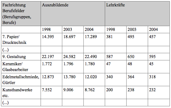 Schon das Berufsbildungsgesetz vom 23. Mai 2005 hatte jedoch die Verbindlichkeit des Berufsfeldkonzepts für die berufliche Bildung, die insgesamt als kritikwürdig einzustufen ist (DOBISCHAT/ DÜSSELDORF 2010), aufgehoben und damit auch für den Zuschnitt der beruflichen Fachrichtungen die unselige Kopplung an die Berufsfelder des Berufsgrundbildungsjahres rechtlich obsolet gemacht (LIPSMEIER 2006, 282). Dementsprechend hatte der KMK-Beschluß von 2007 festgehalten, daß die Länder weitere berufliche Fachrichtungen zulassen können. So schuf die Abschaffung der beruflichen Fachrichtung Gestaltungstechnik durch die KMK 2007 zugleich auf Landesebene Raum für die Neukonzeption einer konzeptionell konsequent auf designerische und designnahe Berufe ausgerichteten beruflichen Fachrichtung. Erstmals seit 1973 mit Mediendesign und Designtechnik war es daher möglich, in NRW 2009 wieder eine gestalterisch fokussierte branchenübergreifende berufliche Fachrichtung einzurichten, in der die Kunstgewerbe-Lehrer-Ausbildung eine zeitgemäße Fortführung findet. Die bundesweite Nachfrage nach dem Studium und seinen Absolventen legt schon jetzt nahe, daß diese Fachrichtung bei der nächsten KMK-Reform auch bundesweit ihren Platz finden wird. Die nachfolgende Übersichtstabelle (Tabelle 1) zeigt diese Entwicklung in kompakter Form.