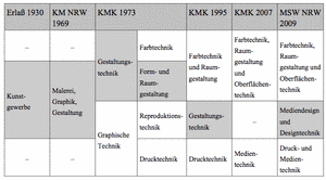 So wurde 1973 die berufliche Fachrichtung Gestaltungstechnik analog zum Berufsfeld des Berufsgrundbildungsjahres Farb- und Raumgestaltung angelegt. Waren dieser beruflichen Fachrichtung zunächst die auf Ausbaugewerke ausgerichteten speziellen beruflichen Fachrichtungen Farbtechnik sowie Form- und Raumgestaltung zugeordnet (vgl. KMK 1973), so war Gestaltungstechnik doch von Anfang an zugleich ein Sammelbecken auch für die Lehrerbildung der nirgends sonst angemessen berücksichtigten kunstgewerblichen Splitterberufe. Ihre Kompetenz erstreckte sich schon bald auch auf die gestalterischen und zunehmend designerischen und designnahen Druck- und Medienberufe. Diese Berufe fanden ihrerseits in der beruflichen Fachrichtung Graphische Technik, die entgegen der ursprünglichen Konzeption ab 1973 mit einer mehr und mehr ingenieurwissenschaftlichen Ausrichtung eingerichtet wurde, keine angemessene Berücksichtigung. So war die berufliche Fachrichtung Gestaltungstechnik trotz des Zusatzes -technik, trotz der Verbindung mit den speziellen beruflichen Fachrichtungen Farbtechnik sowie Form- und Raumgestaltung und trotz einer nirgends klar festgeschriebenen Zuständigkeit von Anfang an die unmittelbare Nachfolgerin der Fachrichtung Kunstgewerbe – was bei der Rekonstruktion der Genese der beruflichen Fachrichtungen leicht übersehen wird (so etwa bei HERKNER 2010, 54).