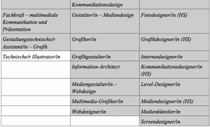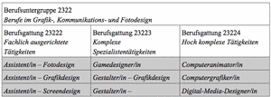 In derselben Berufsgruppe (232: technische Mediengestaltung) finden sich neben technisch fokussierten zudem unter den Berufen im Grafik-, Kommunikations- und Fotodesign weitere designerische oder designnahe Berufe (Tabelle 3).